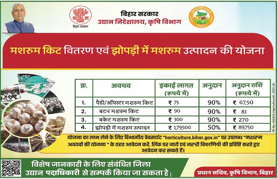 बिहार में मशरूम उत्पादन पर 90% तक अनुदान, झोपड़ी निर्माण पर 50% सब्सिडी