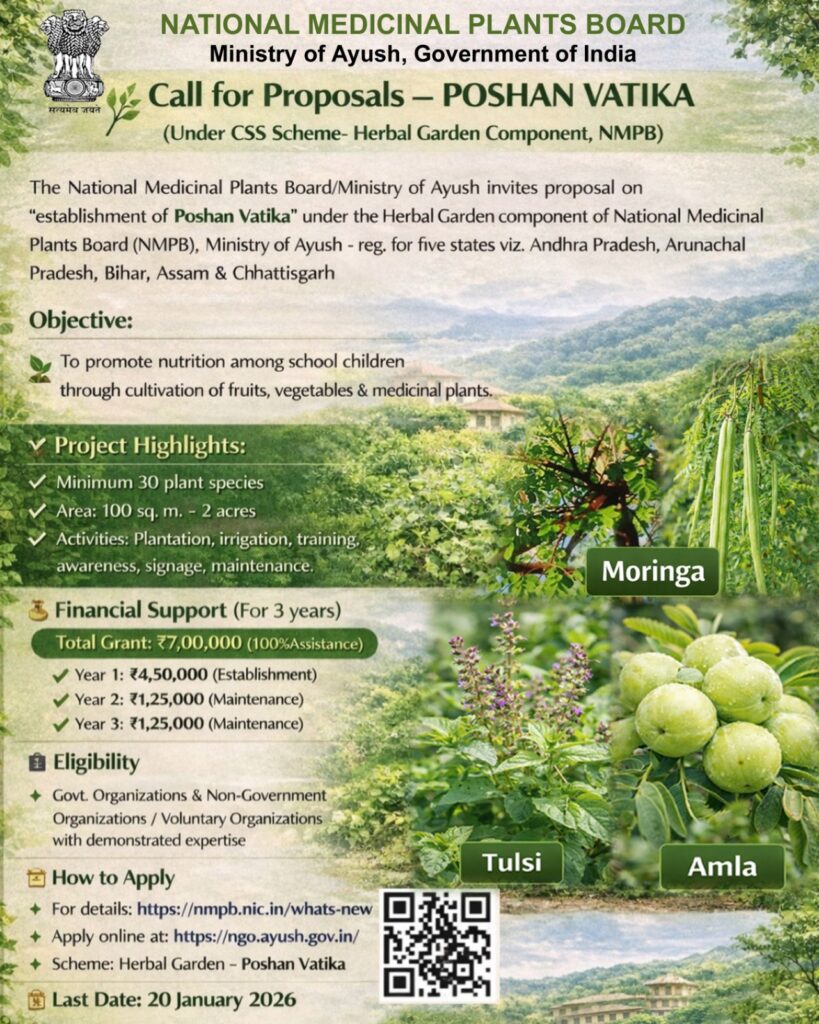 नई दिल्ली।-आयुष मंत्रालय, भारत सरकार के अंतर्गत कार्यरत राष्ट्रीय औषधीय पादप बोर्ड (एनएमपीबी) ने ‘पोषण वाटिका’ की स्थापना के लिए प्रस्ताव आमंत्रित किए हैं। यह योजना केंद्र प्रायोजित योजना (CSS) के तहत हर्बल गार्डन कंपोनेंट के अंतर्गत लागू की जा रही है। इस पहल का उद्देश्य स्कूल स्तर पर बच्चों के पोषण स्तर में सुधार करना और उन्हें औषधीय पौधों की खेती से जोड़ना है। फिलहाल यह योजना आंध्र प्रदेश, अरुणाचल प्रदेश, बिहार, असम और छत्तीसगढ़—इन पांच राज्यों में लागू की जा रही है।