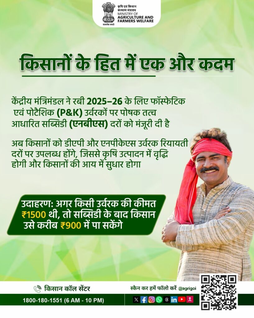 यह निर्णय रबी सीजन 2025-26 के दौरान लागू रहेगा (1 अक्टूबर 2025 से 31 मार्च 2026 तक), जिससे कृषकों को किफायती दामों पर उच्च गुणवत्ता वाले उर्वरक सुनिश्चित हो सकेंगे।