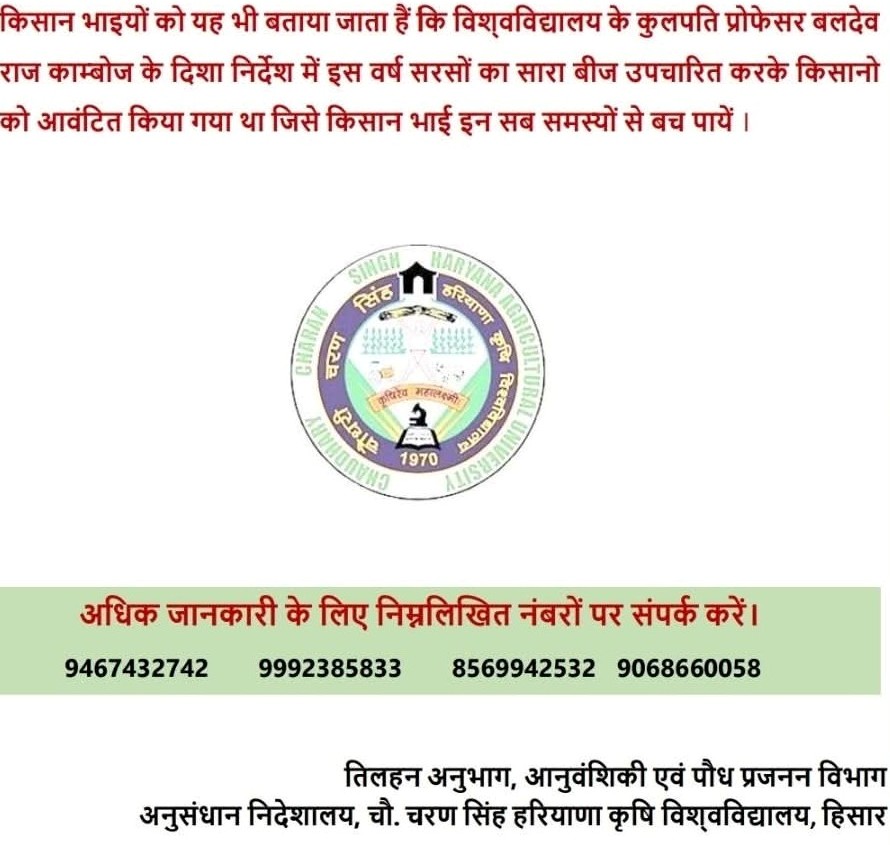 विश्वविद्यालय द्वारा जारी दिशानिर्देशों का पालन करें। खेत की मिट्टी और पौधों की स्थिति का ध्यान रखते हुए समय पर उपचार करें, ताकि सरसों की फसल स्वस्थ और लाभदायक बनी रहे।